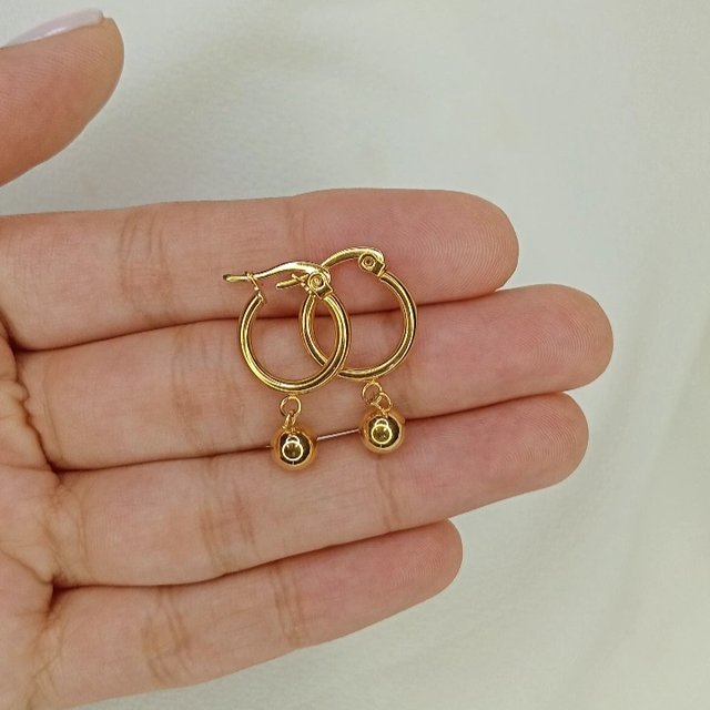 Argollas de acero dorado con dije bolita. Medida: 1 cm.